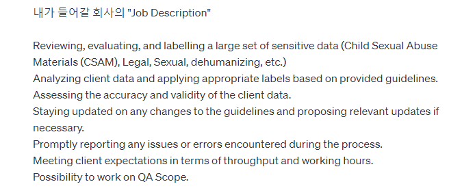 저는 컨텐츠 모더레이터라는 직업으로 말레이시아에서 5년간 근무하고 있습니다. 얼마 전 KOTRA에서 주최한 해외취업박람회가 EQ라는 호텔에서 열렸는데. 취업설명회에서 Chat GPT에 대한 책을 쓰신 분이 나와서 경연을 하는데 Chat GPT로 할 수 있는 것은 무한하고 1조가 넘는 일인 회사가 Chat GPT로 인해 생겨날 수도 있을 것이라는 말에 희망 반 절망 반 느낌이더라고요. 저는 컨텐츠 모더레이터로 일하고 있는데 AI가 우리 직업을 완벽히 대체할 수 있을 거란 생각이 조금 무서웠습니다. 하지만 이제는 AI가 활성화 될 수록 우리가 좀 더 주체적이 되어야한다는 생각도 들더라고요.