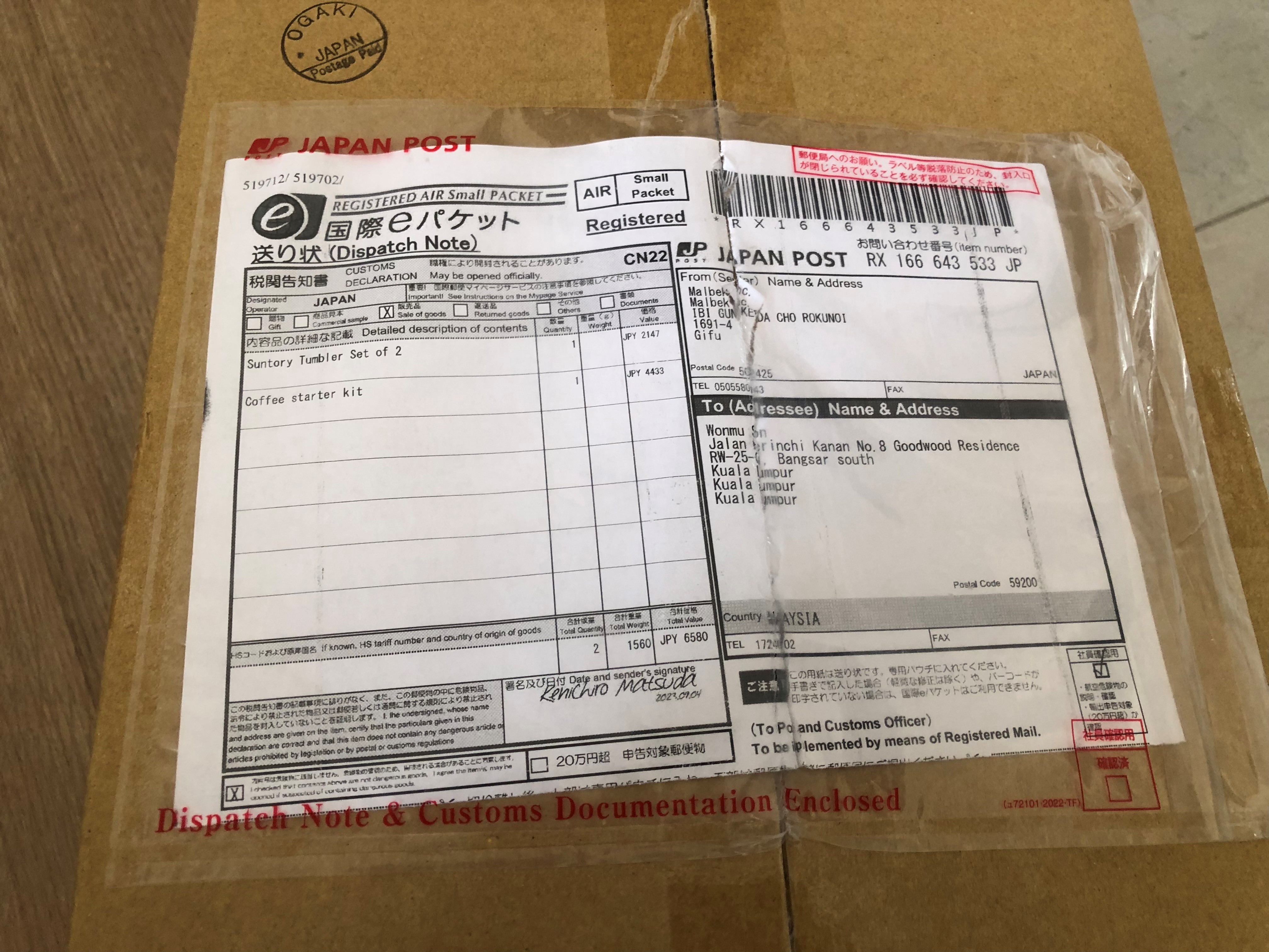 구매일은 8월 31일이었고, 오늘인 9월 15일에 상품이 도착했습니다. 두 제품을 합쳐서 지불한 가격은 514.73(146.2 SGD) 말레이시아 링깃이었습니다.