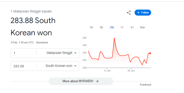 한 달간 추세로 지금은 원화가 강세입니다. :D 여기 현지에 있는 한국사람들은 1링깃당 300원 정도로 간주합니다.