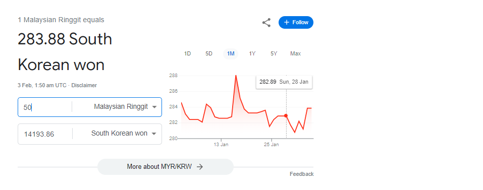 With the trend of a month now, the KRW is strong. :D Koreans here consider it to be around 300 won per ringgit.