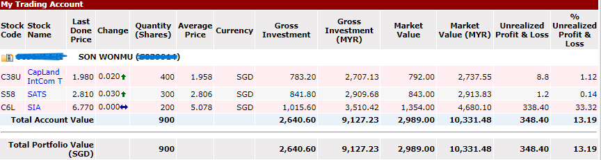 제 주식에서 현재 싱가포르 항공 주식이 제일 많은 수익 부분을 차지하고 있고 그 다음 Capita IntCom T 주식 SATS는 제일 마지막이지만 저는 항공서비스와 물류의 Combination이 언젠가는 시너지 효과를 발휘할 수 있을 것이라 생각을 하기에 목표한 돈이 모아지면 저는 다시 주식을 시작할 예정입니다. :)