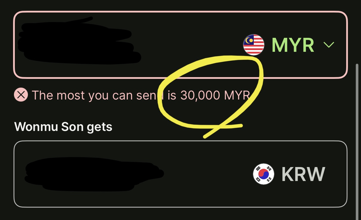 Oh, and for those living in Malaysia, it's worth noting that there are limits on the amount you can send. You can't send more than 30,000 MYR, and the maximum transfer amount to Korea as an individual is 5 million KRW.