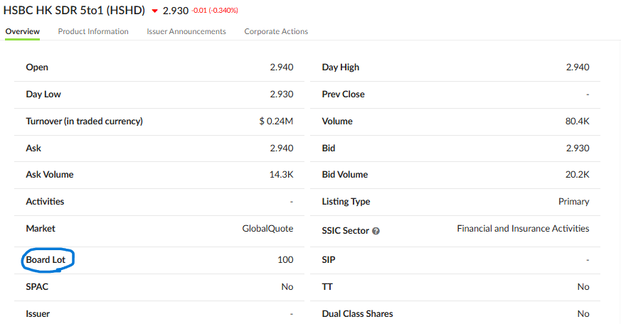 사고 팔 수 있는 단위가 주식 마다 다를 수 있으니까 한번 체크해보는 게 좋을 거 같아요. 그래서 SGX 홈페이지에 가서 SDR종류의 티커를 치면 확인할 수 있어요.