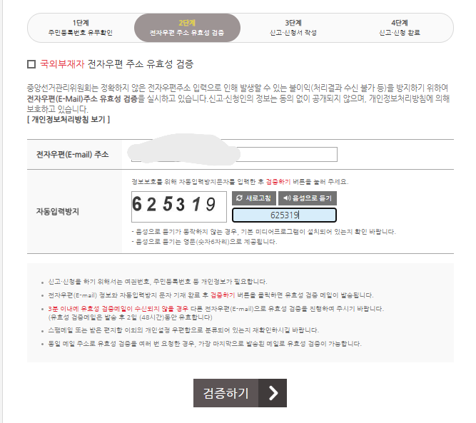 2) 메일 주소와 함께 자동입력방지 번호를 입력하고 검증하기 클릭 해주세요.