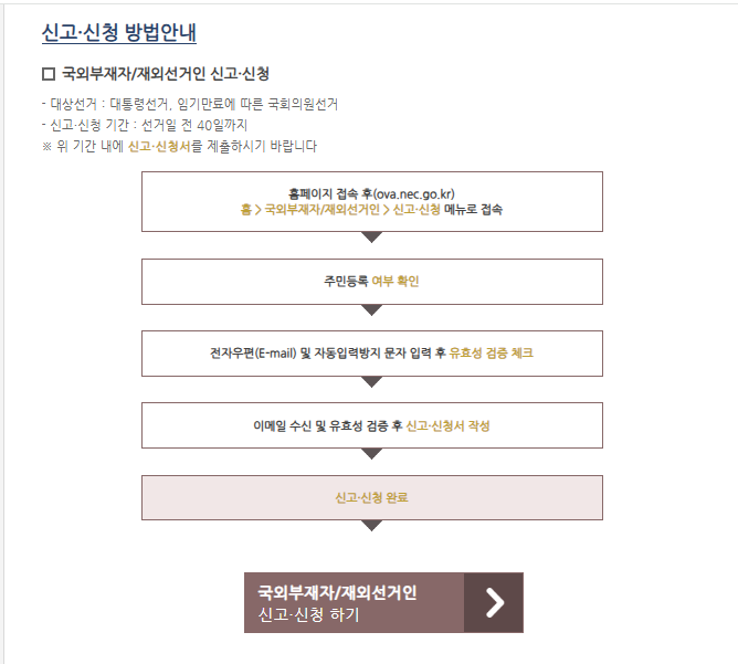 - 재외선거인 등록신청기한(선거일 전 60일까지)에 공관(재외투표관리관)에 재외선거인 등록신청서 제출