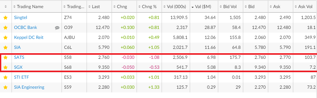 지금 제가 바로 얼마 전에 투자한 SATS그리고 유심히 언제들어갈 지 고민하고 있는 SGX 주가가 떨어지고 있네요. ㅠㅠ 그리고 지금 나머지 주식은 오늘 다들 상승중입니다.