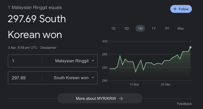 하지만 예전 말레이시아 경제가 좋았을 때는 링깃 대비 한화가 KRW 400 ~ 450원대까지 갔다고 해요.