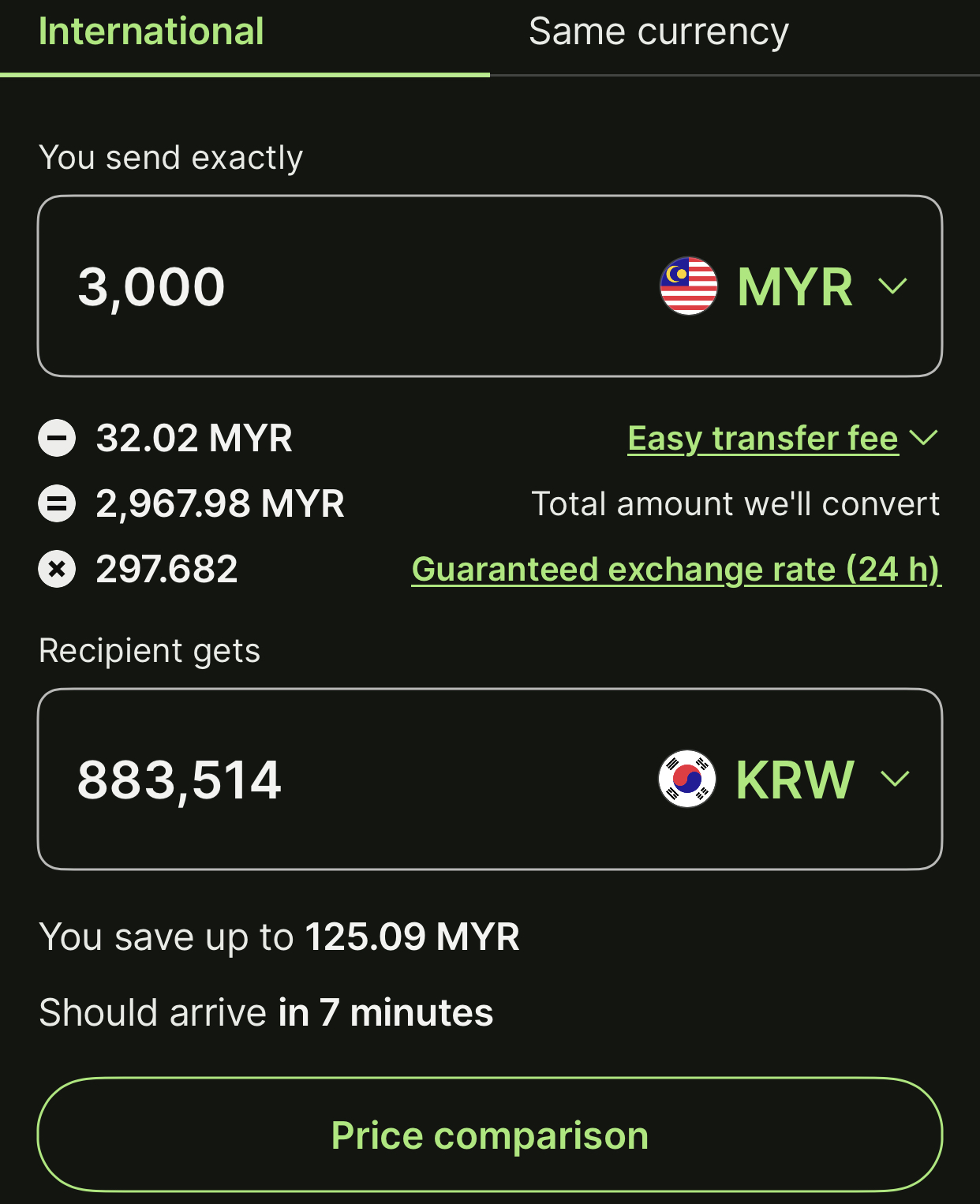 저는 한국계좌와 말레이시아 계좌 두 개가 있어 한국돈이 필요하다면 Wise라는 앱으로 말레이시아 링깃에서 한국 원화로 환전을 하는데 정말 한 1분도 안되서 원화를 받을 수 있습니다. 그리고 최대로 보낼 수 있는 송금액은 30,000 링깃입니다.