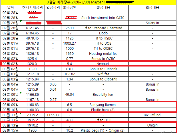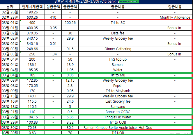 네! 시티은행 계좌로 저는 무지출 챌린지를 시작하고 끝을 맺었는데요. 정확히 3/1일이 되자마자 600링깃이었던 금액을 400링깃으로 맞추기 위해서 Standard chartered 은행으로 200링깃을 송금하고 400링깃으로 시작했습니다. 초록색으로 사각형 칠한 것은 단지 다른 계좌로 송금했을 뿐 사용하지는 않았다는 표식입니다. 그래서 살펴보도록 하겠습니다.