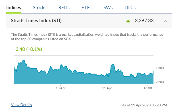 오늘 STI 지수는 3293.83 포인트로 어제의 하락세에 대한 반등이라고 볼 수 있습니다. 세계적으로 지금 높은 금리 인상으로 인해 3월의 CPI(Consumer Price Index) 가 2월의 발표에 비해 낮아질 것으로 예상이 되어서 오늘의 지수는 전일대비 0.1% 올랐습니다.