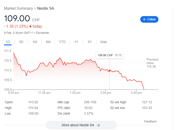 우선 오늘 기준 (2월 10일 말레이시아 시간11:00)으로 네슬레의 주가 차트를 보여드리면서 설명하고자 합니다.