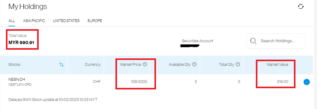 지금은 Total value에서 보시다 시피 제 주식 잔고에 990.91(MYR) 링깃이 있고 네슬레의 Market Price(현재주가)는 109스위스 프랑. 저는 네슬레 주식을 현재 2주를 가지고 있어서 Market value에 표시되는 가격은 218 스위스 프랑입니다.