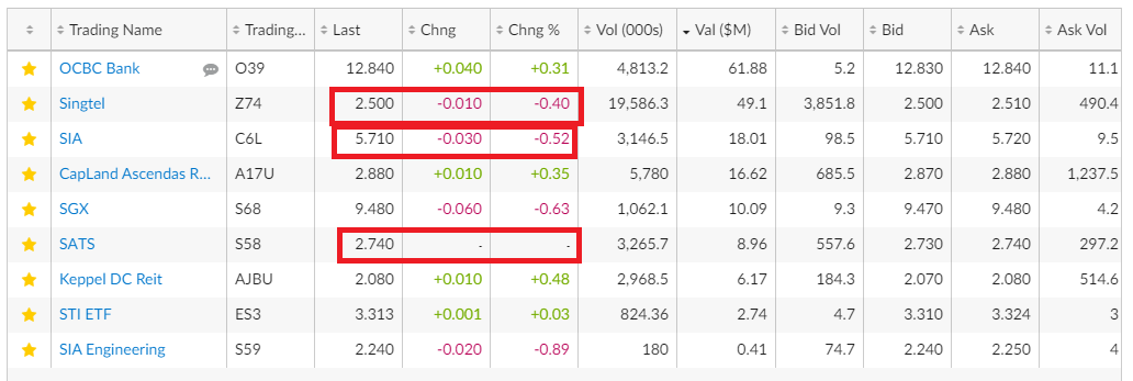 STI지수의 상승으로 인해 많은 주식들이 오름세를 기록했습니다. 하지만 SATS, SIA 같은 항공주들은 원유의 상승세로 인해 수요가 급감해서 오늘의 주가는 하락세를 이어간 것으로 보입니다.