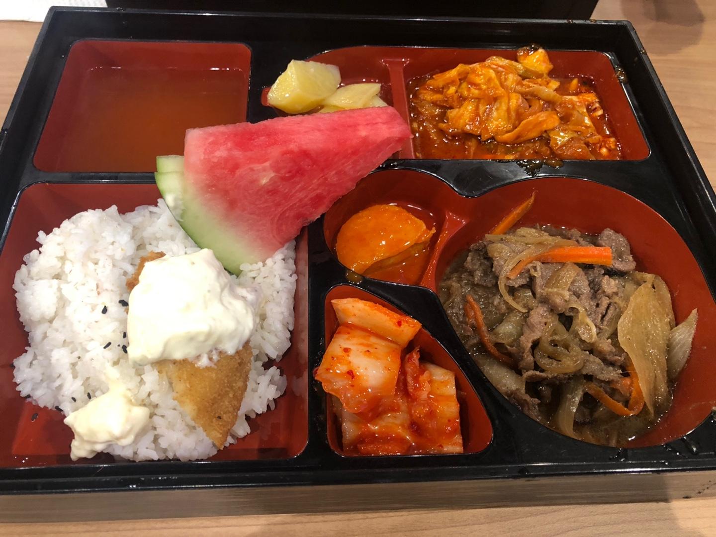 저는 앞서 말씀드렸듯이 Chef Moon Dosirak 이라는 주문했는데 이렇게 나온답니다. 여러가지 음식(소불고기, 닭갈비, 미트볼, 오징어볶음) 중 두 가지 음식을 선택할 수 있는데 저는 소불고기랑, 닭갈비를 주문해서 먹었습니다.