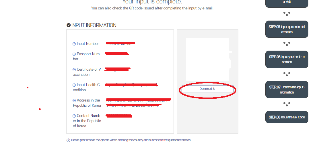 If you completed already, there will be what you have input with a QR code. You can download and get the QR code with your phone and submit it to the quarantine agent in Incheon airport.